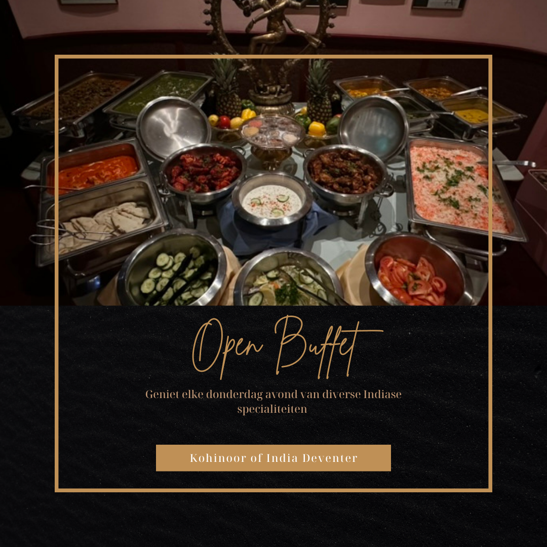 Iedere donderdag verwelkomen wij u graag bij ons uitgebreide buffet, waar u kunt genieten van een culinaire ontdekkingsreis door de betoverende wereld van de Indiase keuken.
